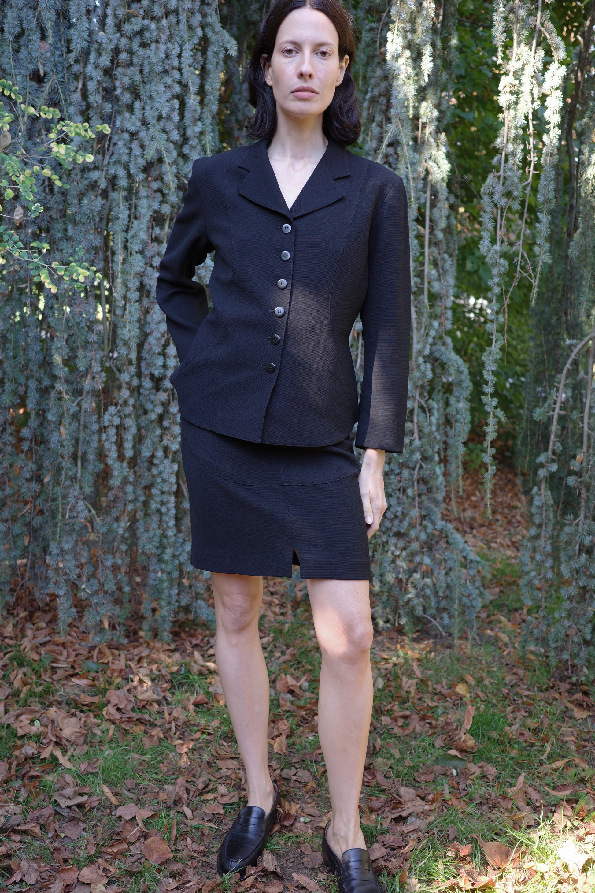 This vintage black wool set from the 1980s is the work of Franco-Tunisian couturier Azzedine Alaïa, made in France, and embodies the architectural precision and understated elegance that defined the designer’s legacy.