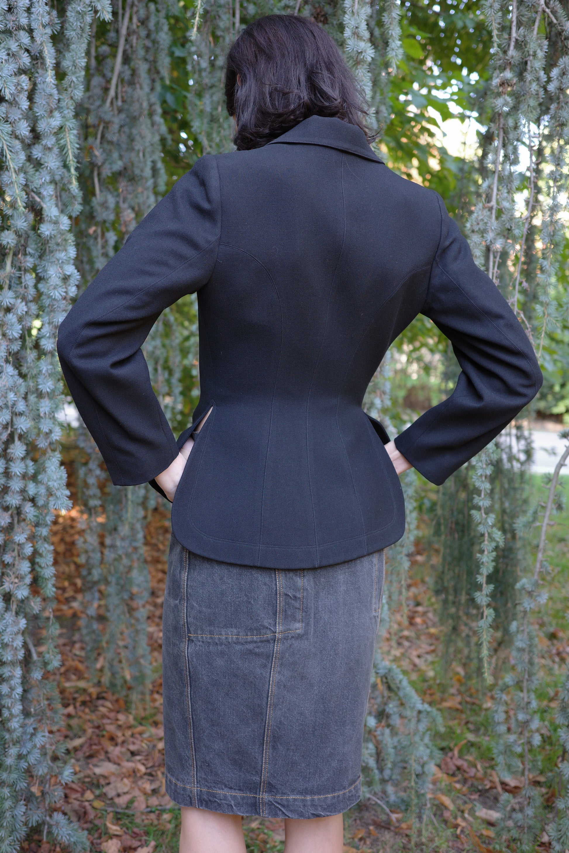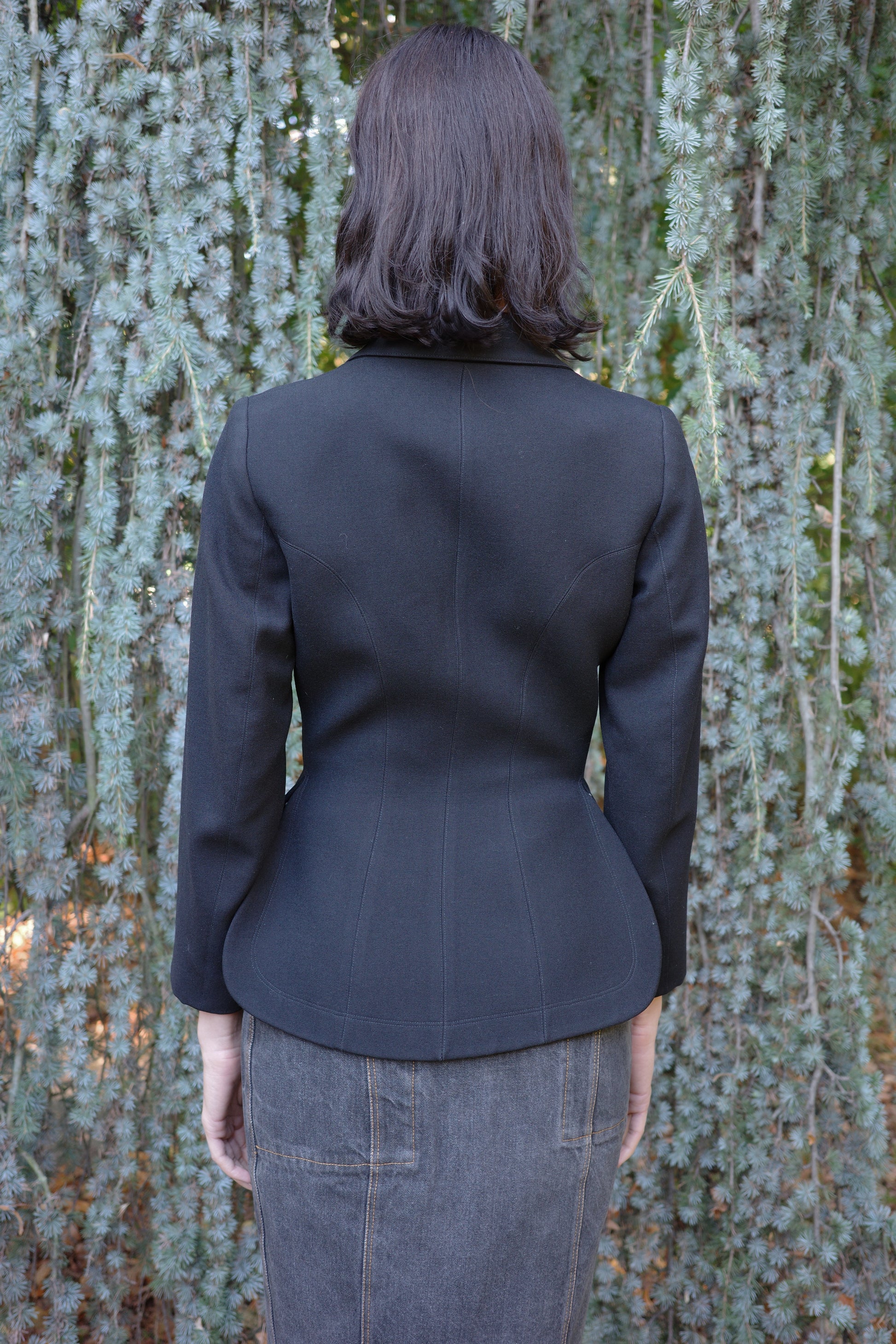Runway piece from Azzedine Alaïa’s 1991 Paris show, showcasing the couturier’s sculptural mastery. Crafted in wool, it features Alaïa’s signature black hook closure at the front and a hemline that flares like a flower - an iconic element of his architectural vocabulary.