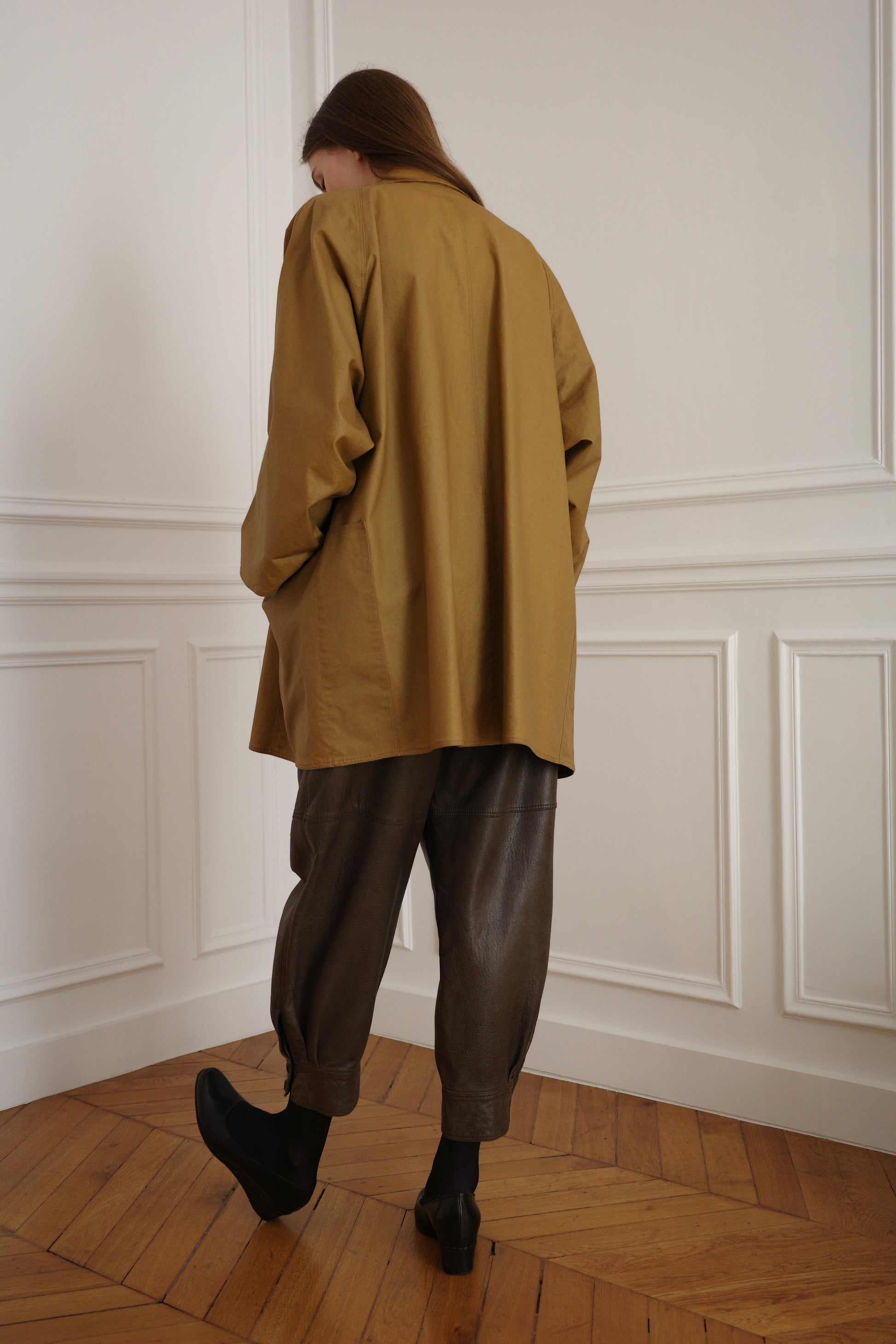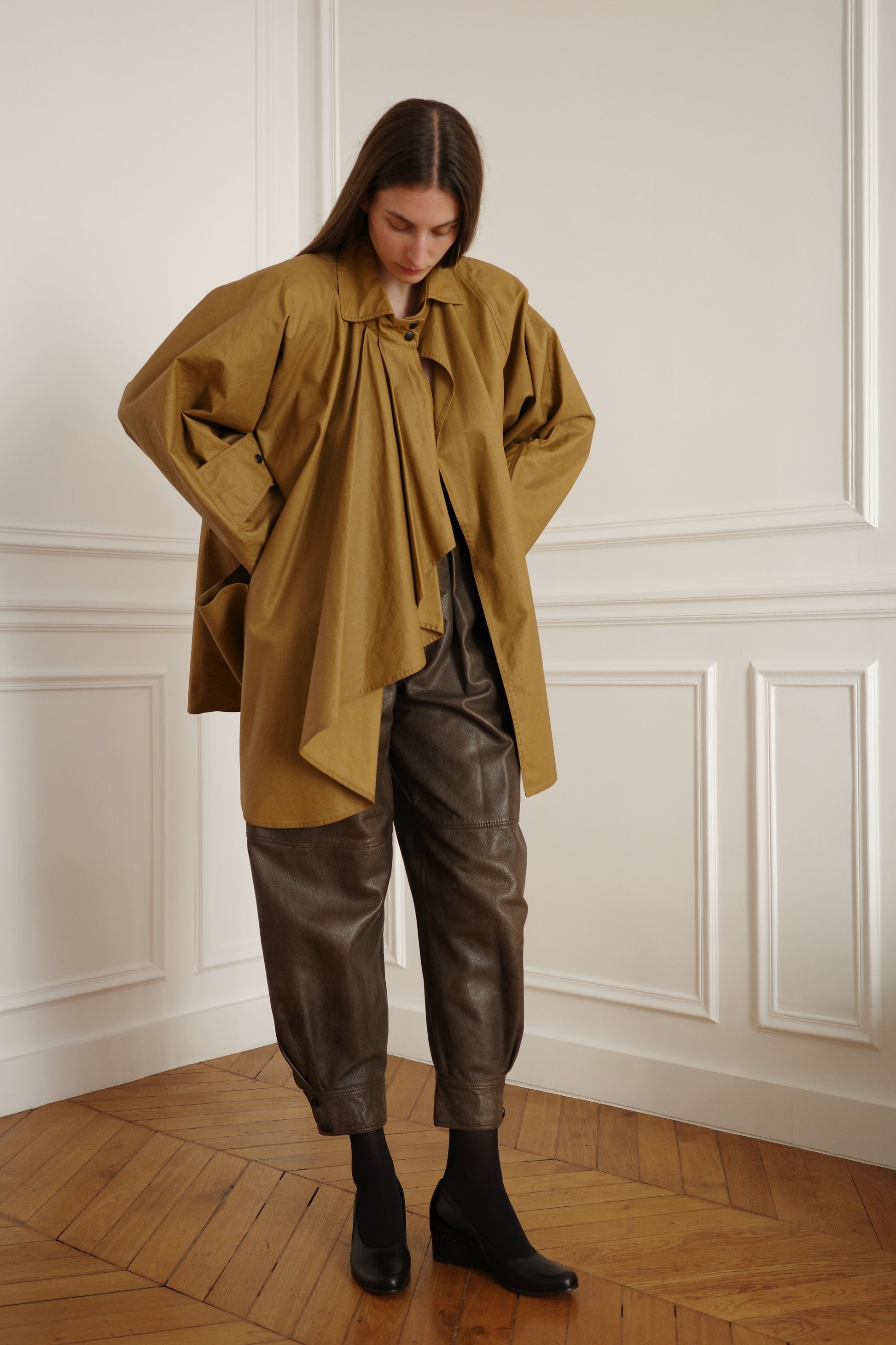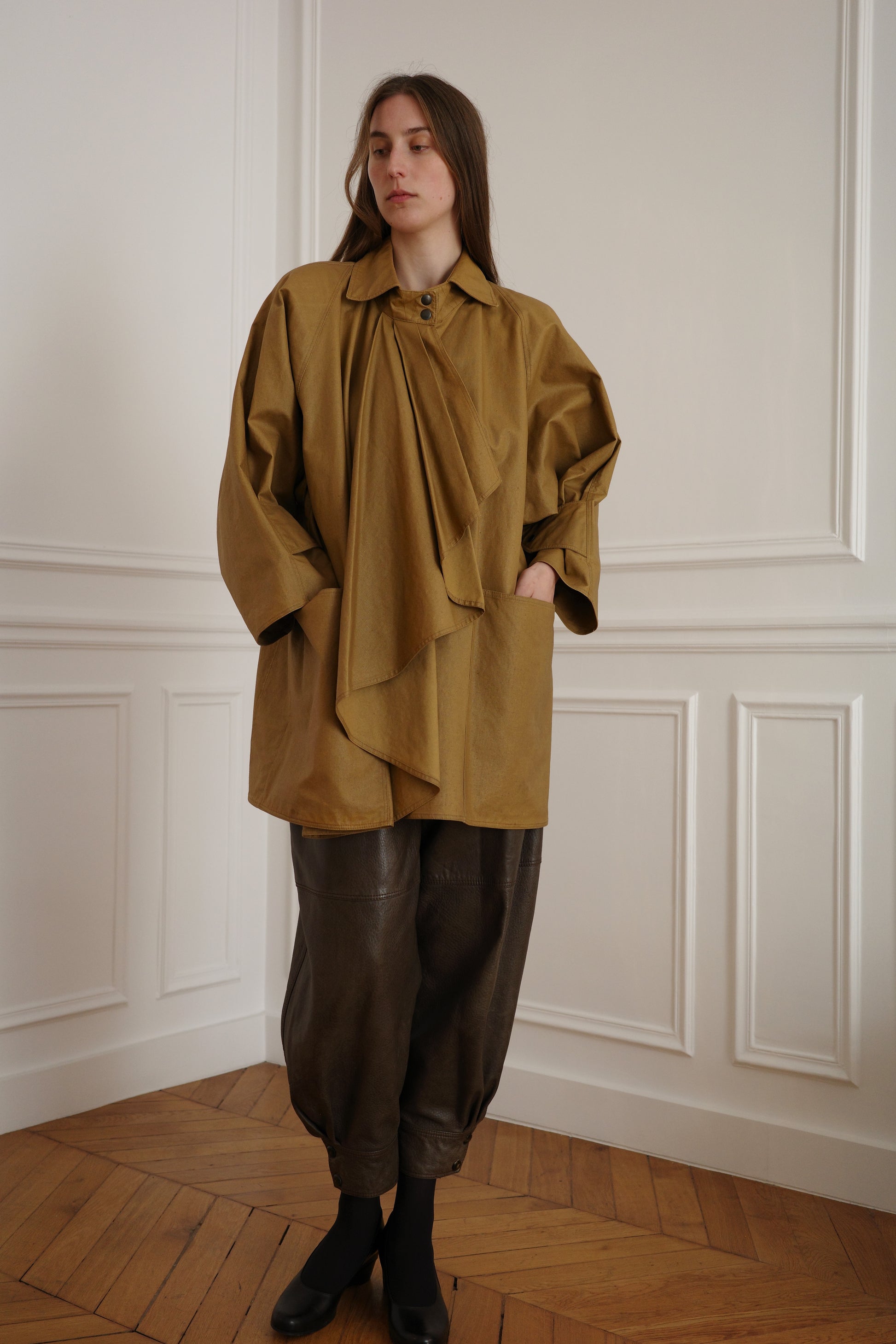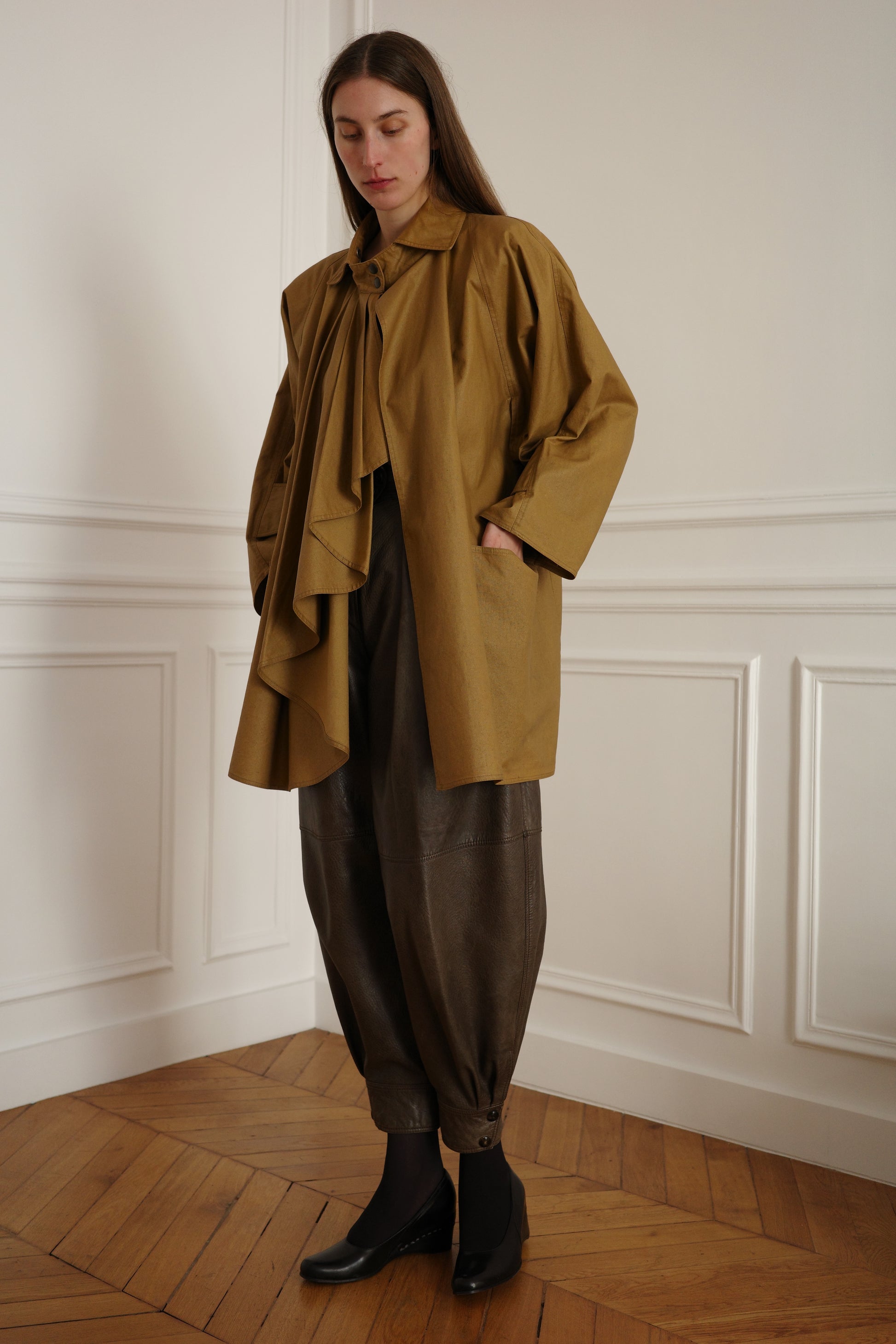 Crafted in France from waxed cotton gabardine, this oversized coat exemplifies Anne-Marie Beretta’s architectural approach. The front is defined by a flowing, draped panel that adds movement and volume to the structured silhouette. The coat fastens with snap buttons at the neckline.
