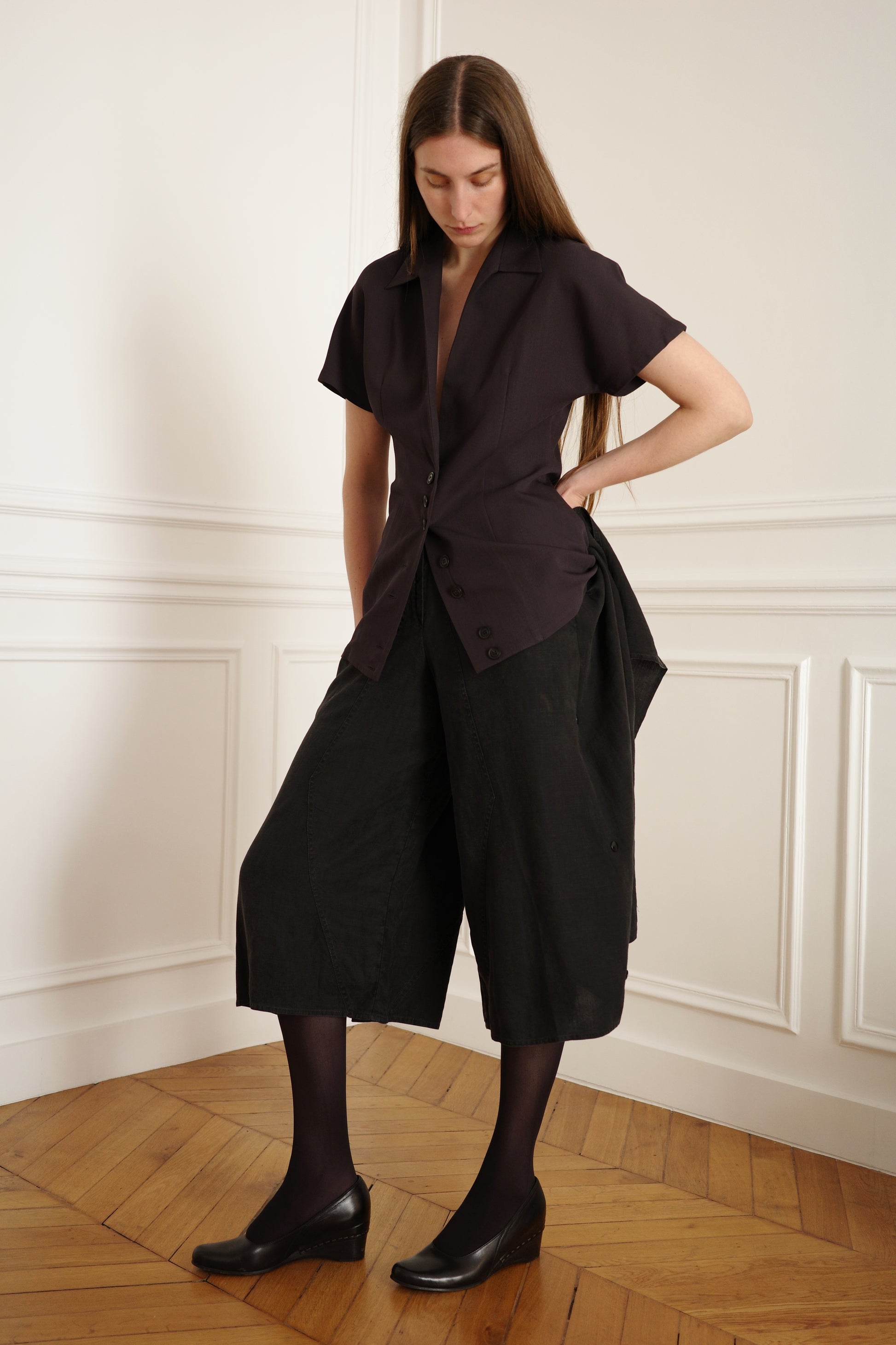 These runway culottes by Anne-Marie Beretta fasten on the sides with snap buttons, allowing the opening along the leg to be adjusted, and feature overlapping fabric panels that add movement and volume.
