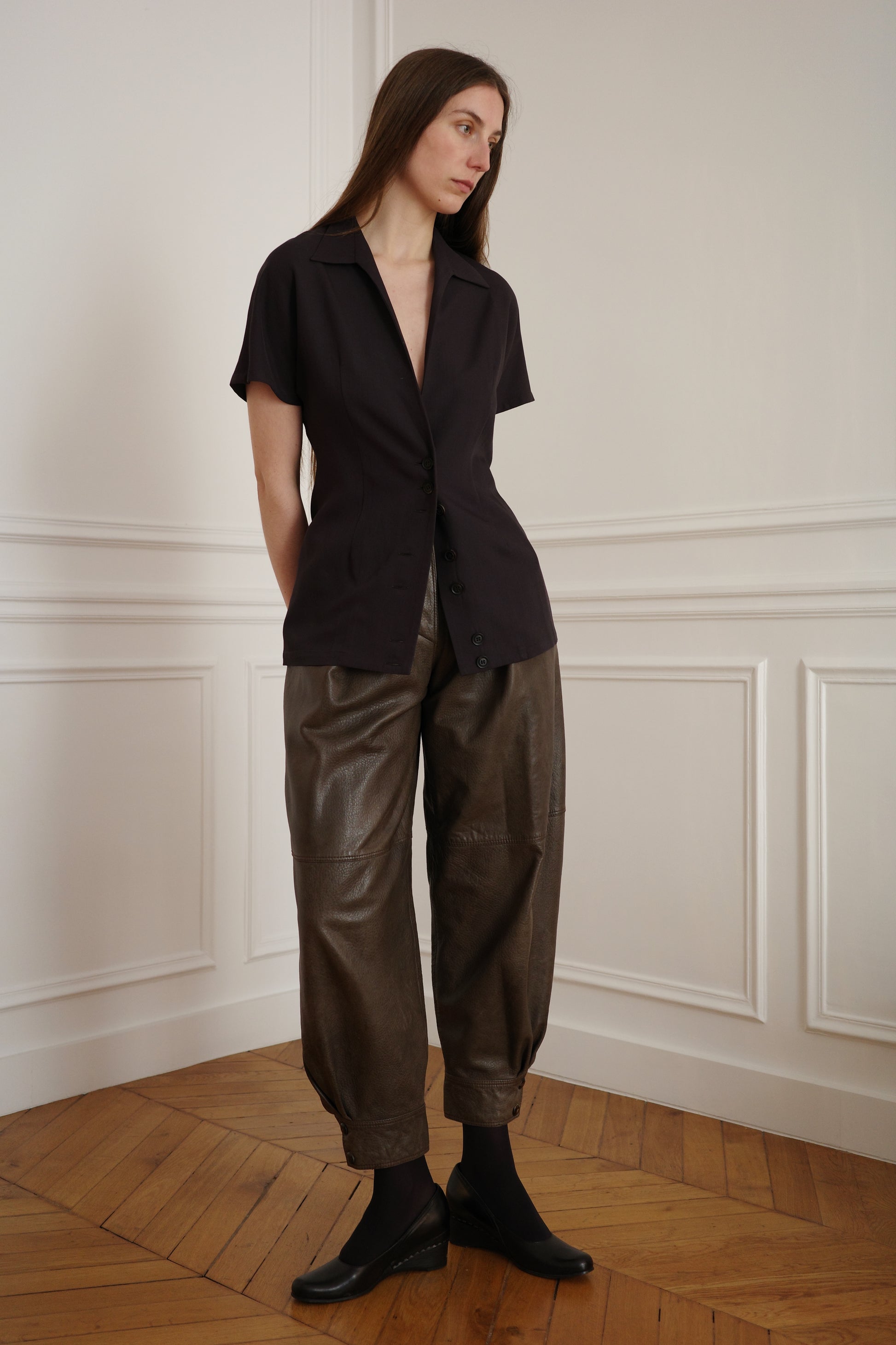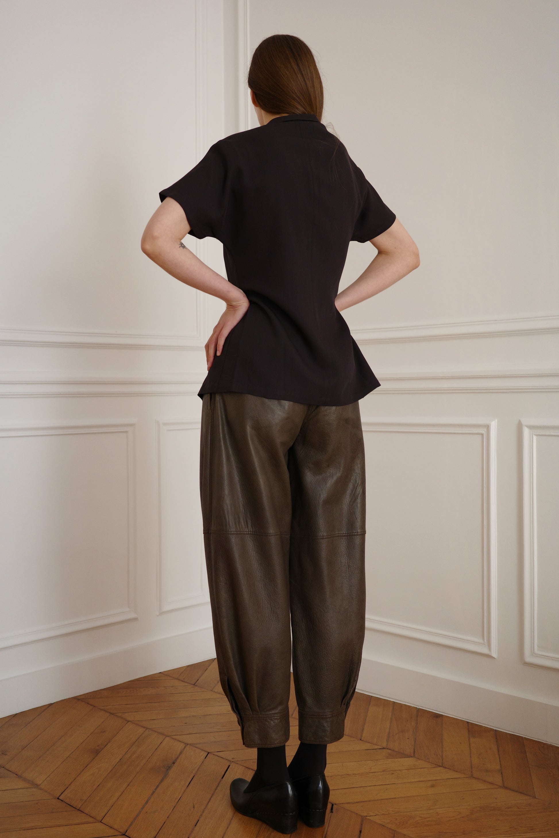 Rare runway piece by Anne-Marie Beretta. These rounded-shape leather pants, crafted from textured brown buffalo leather, play with volume and proportion.