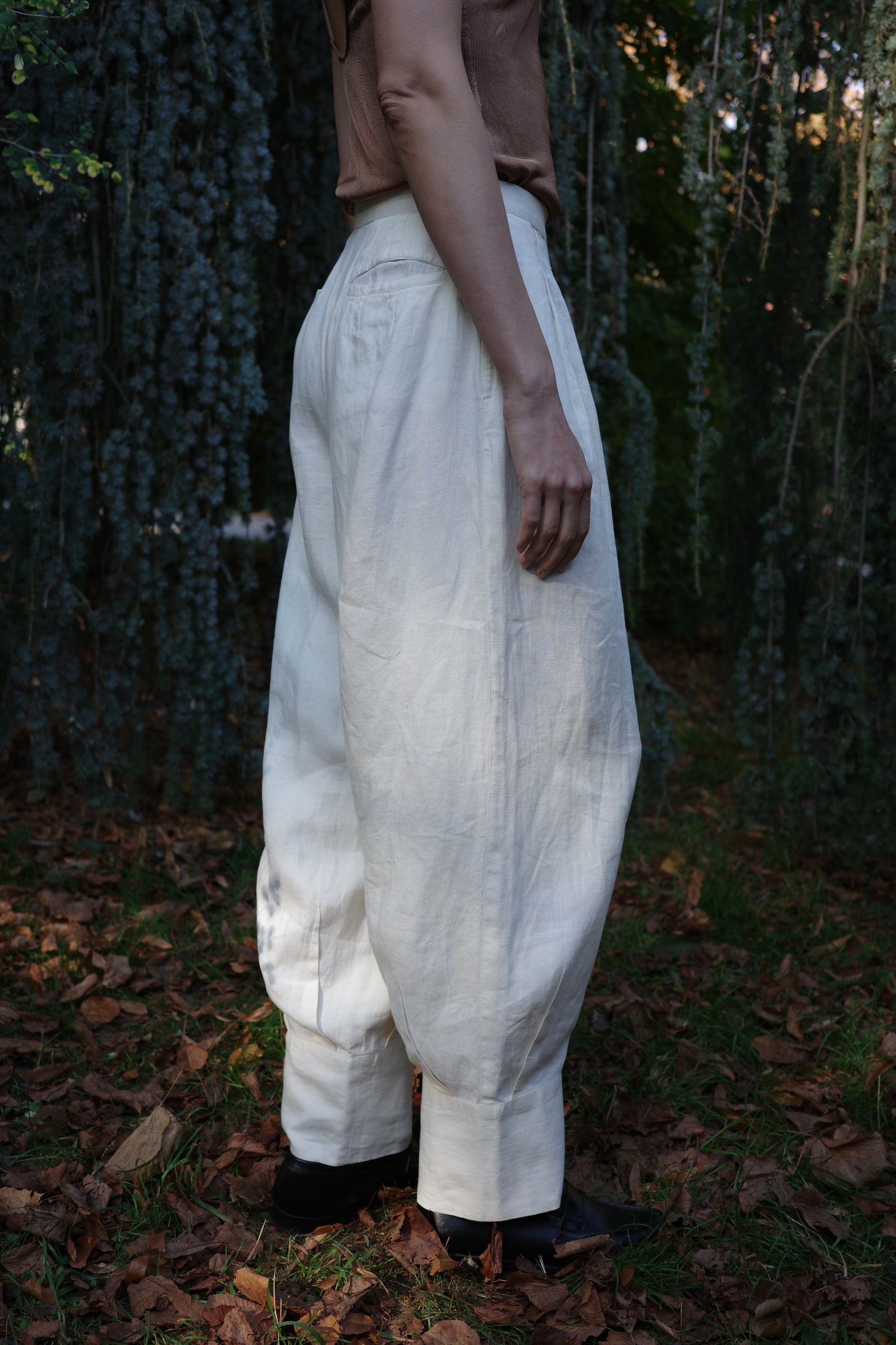 From the Permanente line of the Spring-Summer 1988 collection, these ecru trousers by Issey Miyake exemplify the designer’s mastery of form and textile. Crafted from 100% linen, the cut reflects Miyake’s signature approach to volume and movement. A rare archival piece, emblematic of the Permanente line’s enduring philosophy: timeless design beyond trends.