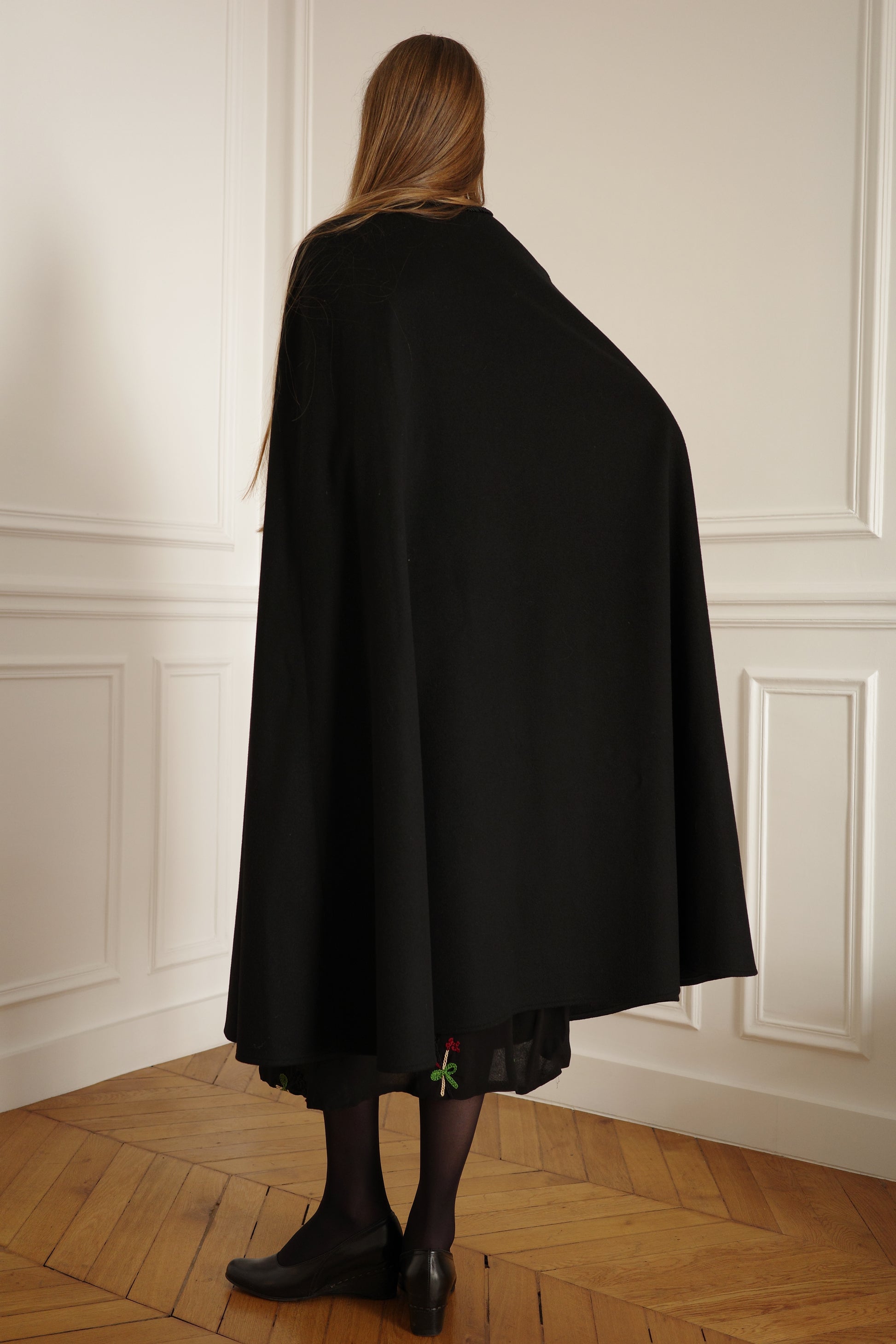Crafted from deep black wool, the cape features a loose, flowing silhouette. A braided passementerie cord outlines the collar and fastens elegantly at the neckline.