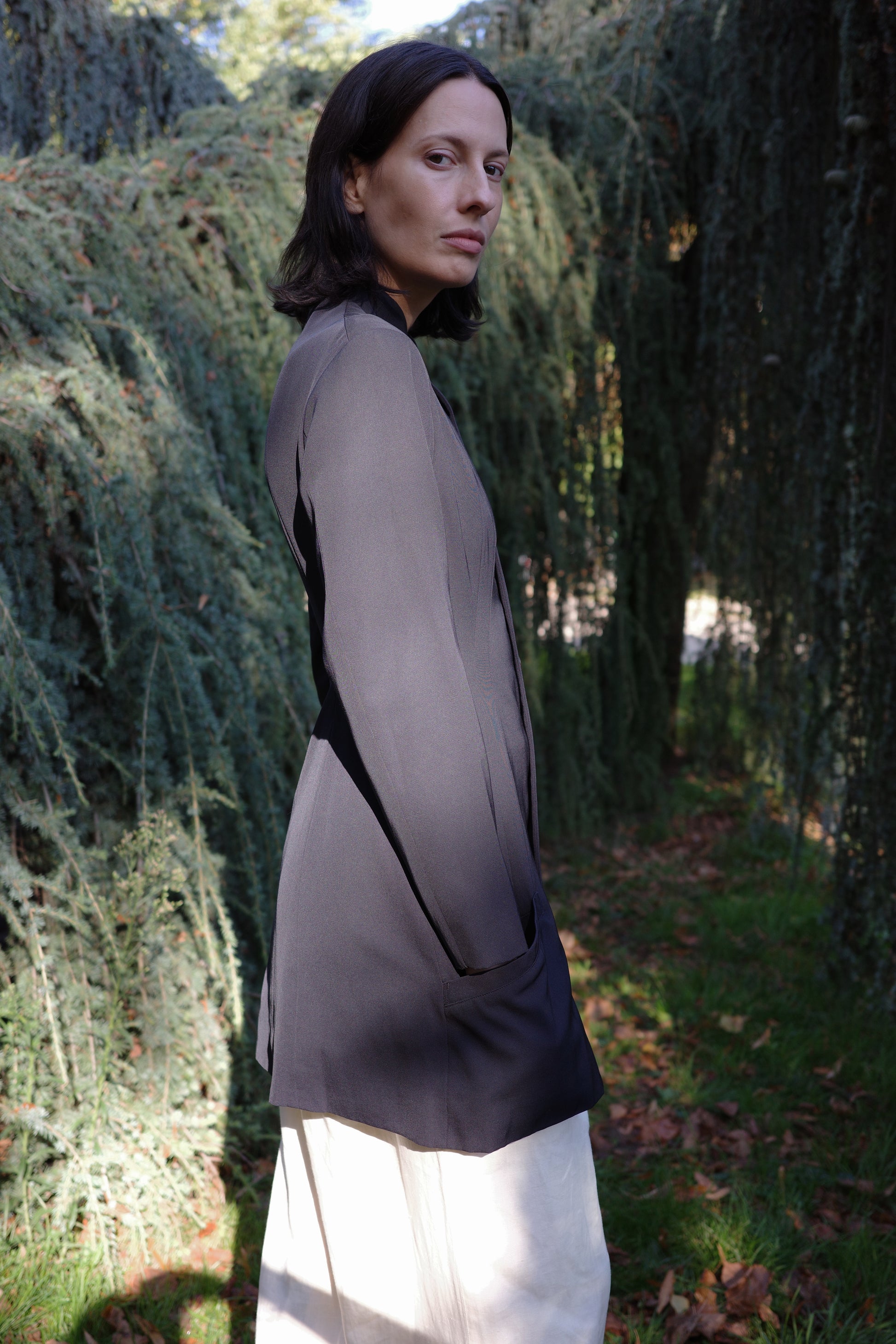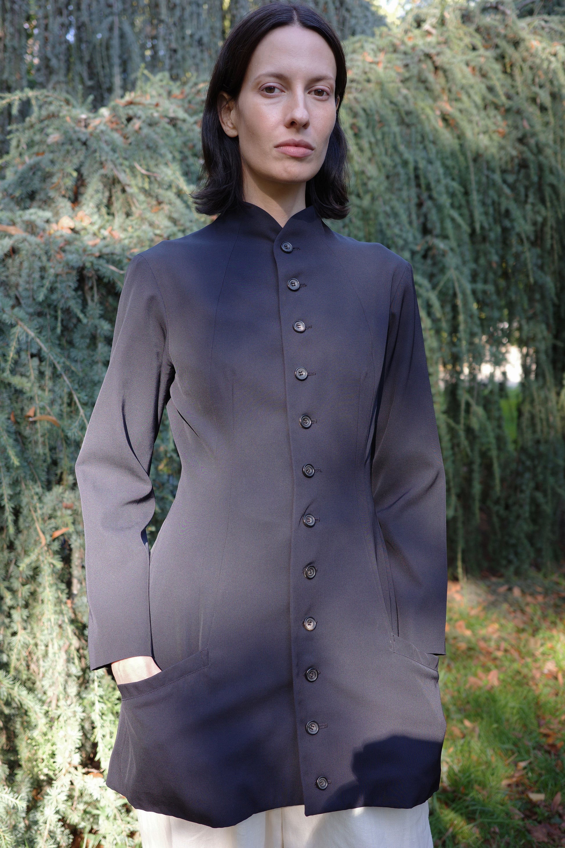 This Yohji Yamamoto jacket, from the designer’s early years, showcases his mastery of tailoring and elegance. Made in France from dark blue wool, it features a long, structured cut with a stand collar and a single-breasted front. Large side pockets add a functional note to the sculptural silhouette.